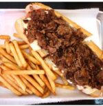 Enjoy a freshly baked 6-inch roll stuffed with thinly sliced, tender steak strips, sautéed onions, peppers, and mushrooms, and topped with rich, melty cheese. Served alongside a portion of crispy golden fries 🍟 and an ice-cold drink 🥤, this combo delivers the perfect balance of hearty, cheesy, and satisfying flavors.