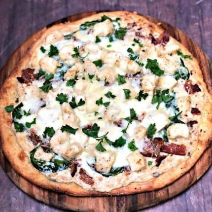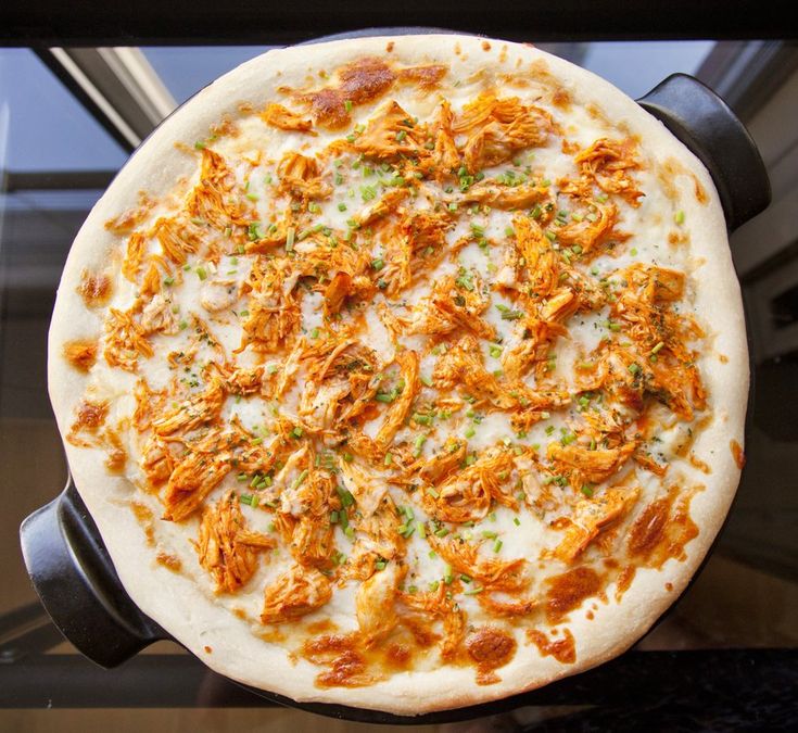 We start with a zesty Buffalo sauce base, then pile on juicy chunks of grilled chicken, smother them in a blend of gooey mozzarella & cheddar cheese, and top it off with crisp onions and peppers. Finished with a drizzle of creamy ranch or blue cheese, this pizza delivers the perfect balance of spicy, cheesy, and tangy flavors.
